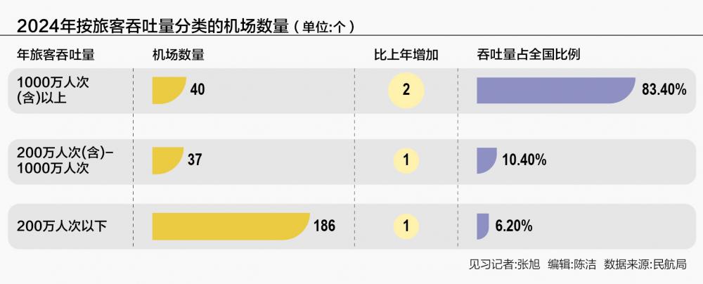 根据中国民航局的数据,2024年,我国年旅客吞吐量为200万人次以下的机场为186个,占全部263个机场数量的70.7%,这部分机场的旅客吞吐量占全国的比例为6.2%。