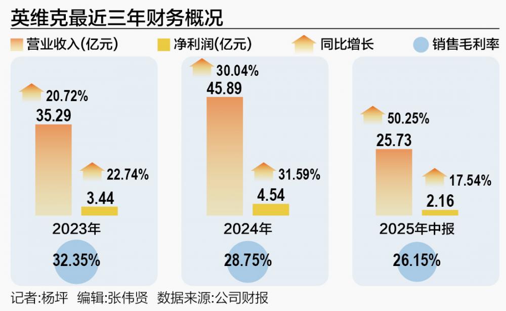 同时,英维克在境内市场的毛利率持续承压——上半年境内业务毛利率达22.98%,而去年、前年同期分别为27.28%、27.76%。其境外业务毛利率虽然保持了较大增长,但整体境外收入仅2.59亿元,占总营收的比例只有10%。