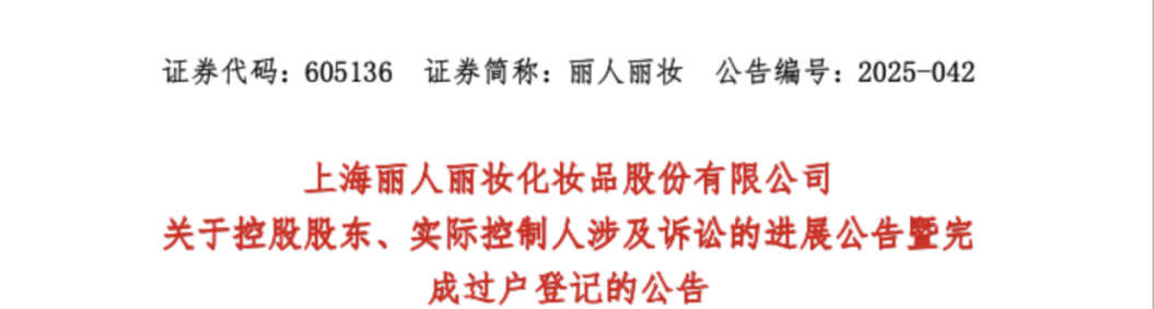 2025年8月21日晚,丽人丽妆公告称,黄韬与翁淑华离婚纠纷所涉股权已完成过户。