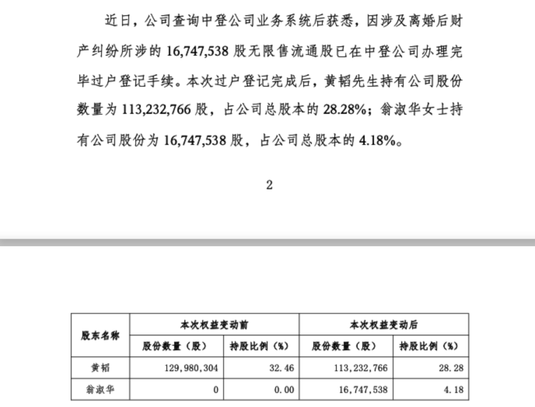 2025年1月,公司公告,黄韬被判决将其持有的1674.75万股公司股份(占公司总股本的4.18%)归前妻翁淑华所有。