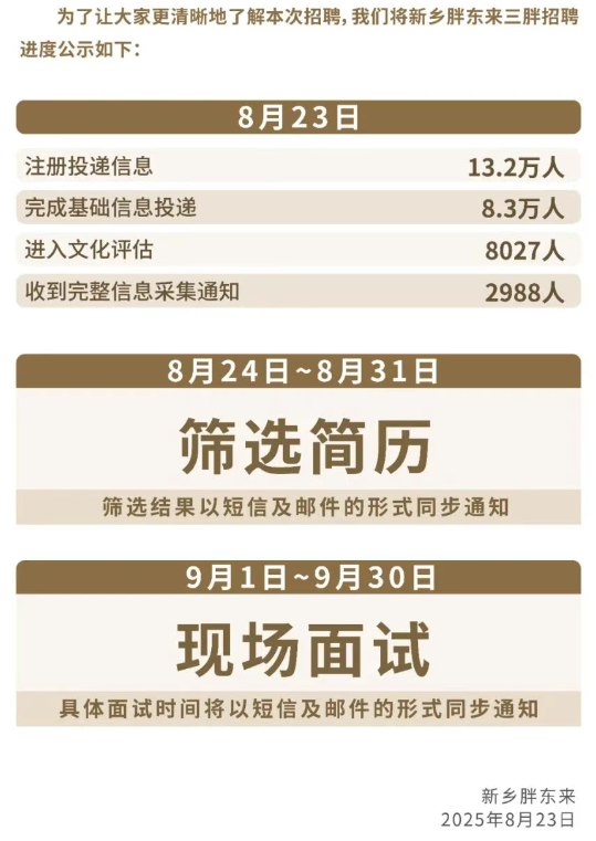 8月23日深夜,新乡胖东来“三胖”店公示当天招聘进度。截至当日,招聘报名系统数据显示,系统注册信息13.2万人,其中8.3万人成功完成基础信息投递。