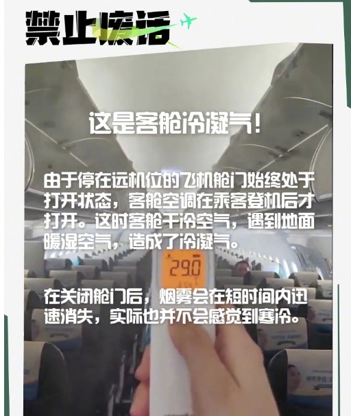 经核实,视频中展示的是夏季客舱内的潮湿空气和空调制造的干冷空气相遇后,形成正常的冷凝水汽现象。飞机起飞后,冷凝水汽现象就会很快消失。该现象是常见的物理反应。