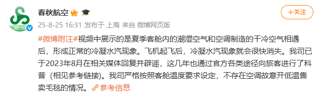 8月25日,春秋航空发布声明称,公司关注到网络上出现大量“将夏季客舱内出现的正常冷凝水汽现象与客舱销售强行关联”的不实信息。
