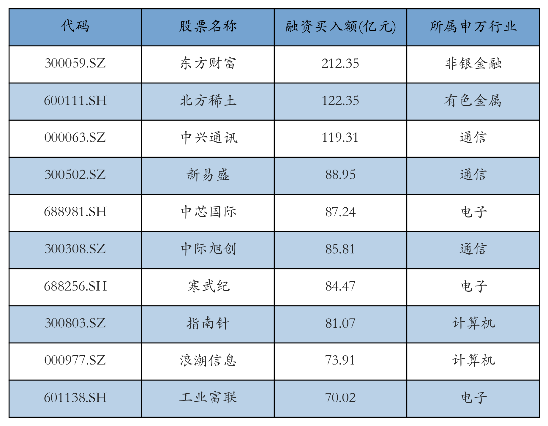 上周两市共有3444只个股有融资资金买入,共有265只个股买入金额超10亿元,其中东方财富、北方稀土、中兴通讯排名前三,买入金额分别212.35亿元、122.35亿元、119.31亿元。融资买入额前10个股详情见下表: