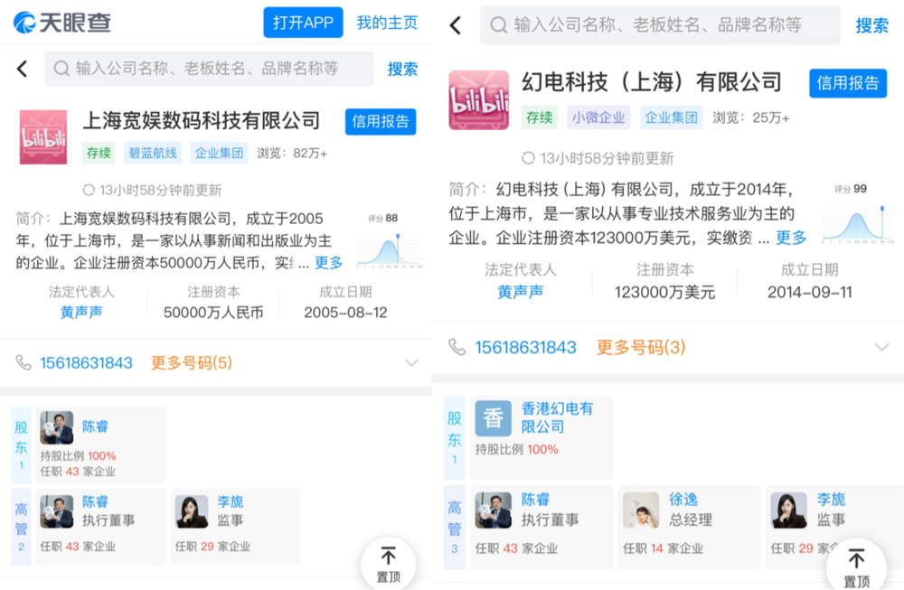 从工商信息来看,上海宽娱作为B站最核心的运营实体,变更后陈睿仍持有该公司100%股权,但不再担任法定代表人和执行董事。幻电科技则由香港幻电有限公司全资控股,专注于手游业务,陈睿不仅卸任职务且完全退出持股,标志着对这一板块的彻底放手。