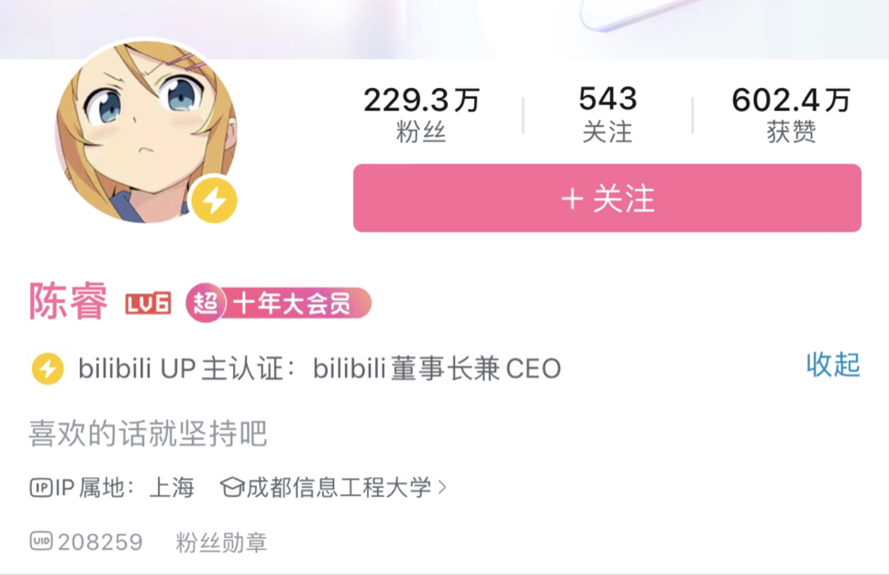 但他依然热爱着二次元,直到今天,陈睿的B站头像还是《俺妹》中的高坂桐乃。如果没记错的话,他应该是唯一一个还保留着二次元头像的CEO了。