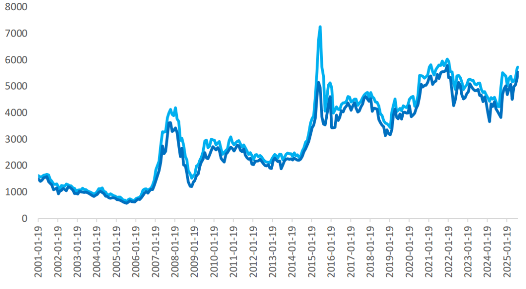 从万得全A指数来看,从2005年7月最低点576.9点开始,其月度最低点底部逐级抬升,2025年8月月度最低点已经来到了5532.5点,接近上一轮牛市月度低点的最高值(2021年12月,5786点)。