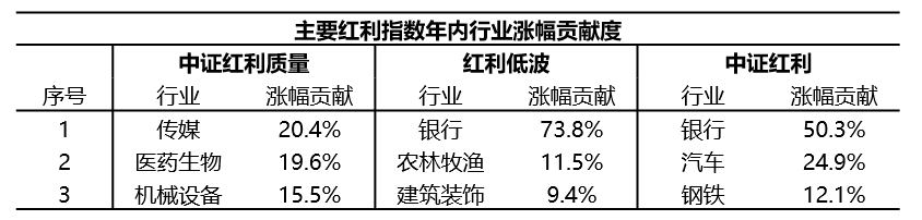 解构收益来源,今年银行股在多只红利指数中贡献了较大涨幅。中证红利质量指数的收益结构更多元,其年内涨幅主要得益于传媒、医药生物、机械设备等板块的驱动。