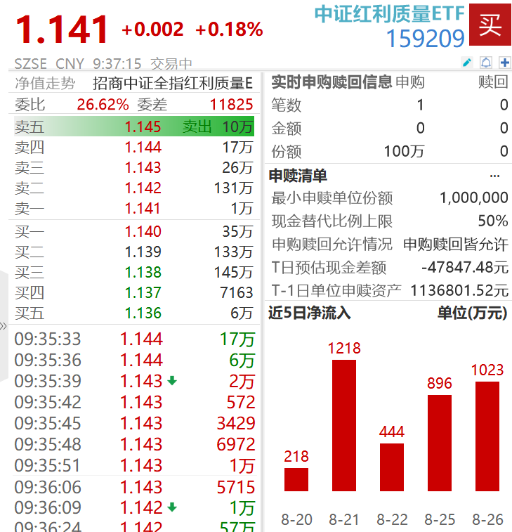 8月27日,红利品种——中证红利质量ETF(159209)盘初延续上行,行情数据显示,该ETF近12个交易日获资金连续净流入超5600万元,今日早盘再迎申购。