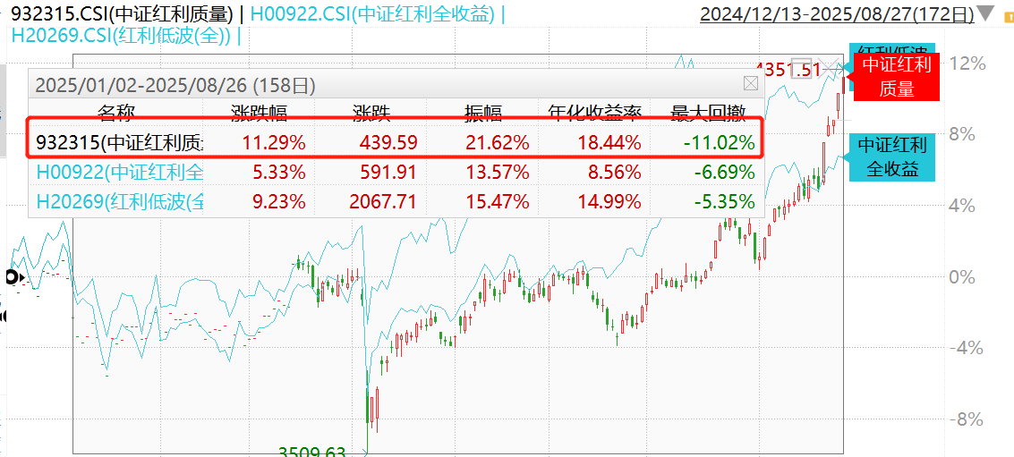 从年内表现看,截至8月26日,中证红利质量全收益指数(下称中证红利质量指数)涨超11.29%,同期中证红利全收益指数(下称中证红利指数)、中证红利低波动全收益指数(下称红利低波指数)涨幅为5.33%、9.23%。