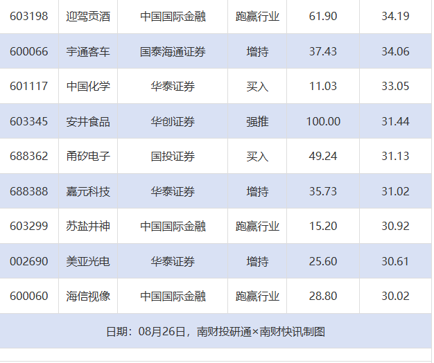 南财投研通数据显示,8月26日,券商给予上市公司目标价共76次,按最新收盘价计算,目标价涨幅排名居前的公司有今世缘、纳睿雷达、中钢国际,目标价涨幅分别为68.35%、46.71%、45.19%,分别属于白酒、军工电子、专业工程行业。