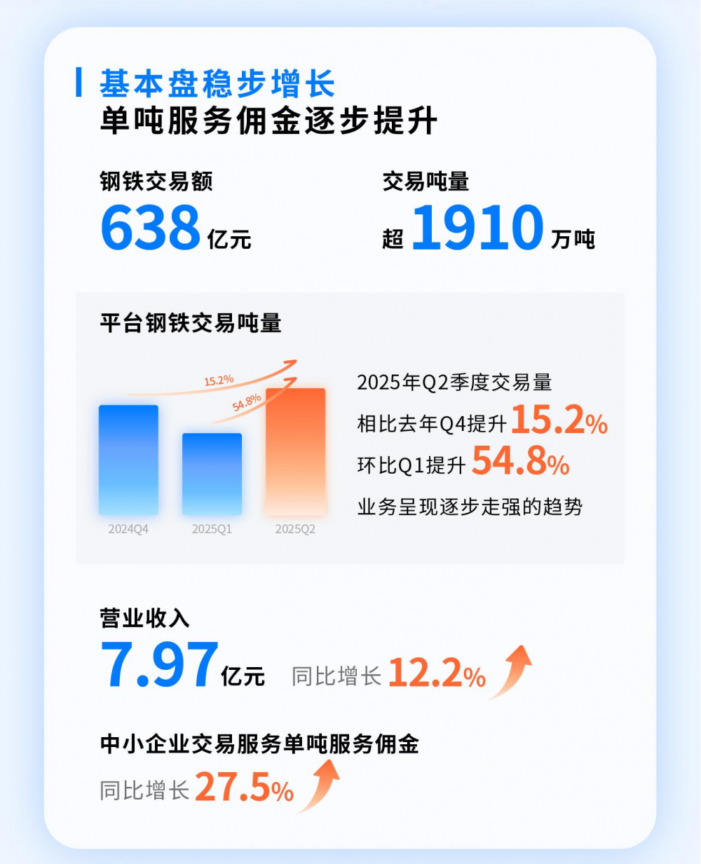 今年上半年钢铁交易额达638亿元,钢铁交易吨量超1910万吨。2025年第二季度平台钢铁交易量相比去年第四季度提升15.2%,环比第一季度提升54.8%,交易业务呈现逐步走强的趋势。
