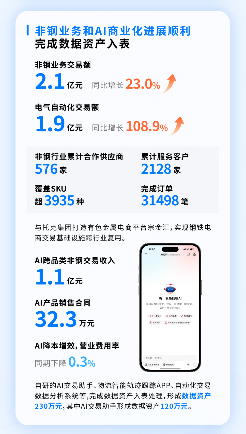 与此同时,公司对自研的AI交易助手、物流智能轨迹跟踪APP以及自动化交易数据分析系统等核心数据资产,开展了数据资产入表处理,集团形成数据资产230万元,其中AI交易助手形成数据资产120万元。