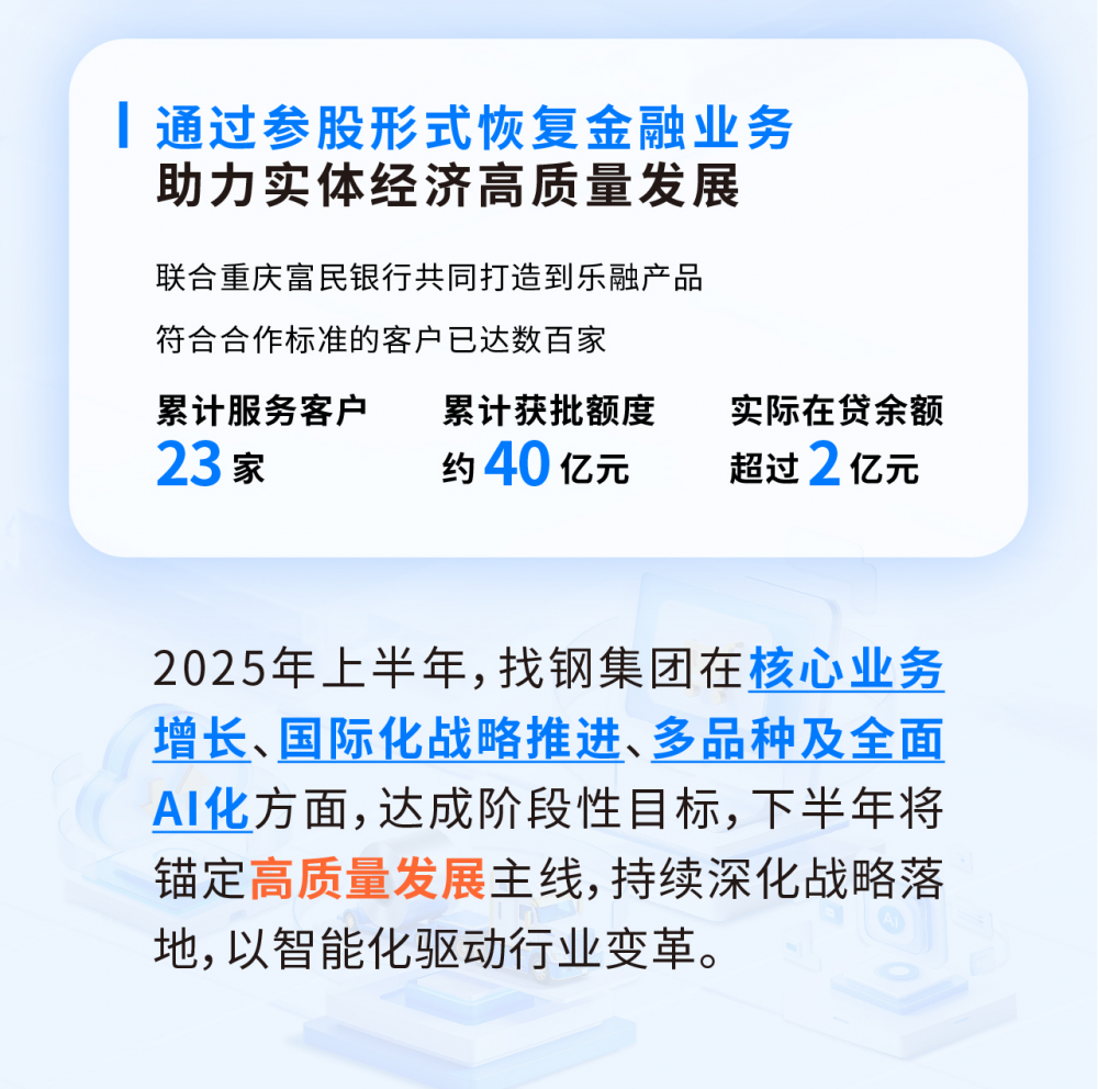 7月,找钢集团携手重庆富民银行推出“到乐融”产品,以参股形式恢复金融科技业务。截至目前,已服务客户23家,累计获批额度约40亿元,实际在贷余额超过2亿元。8月,与国企参股设立供应链公司,优化用户采购体验。