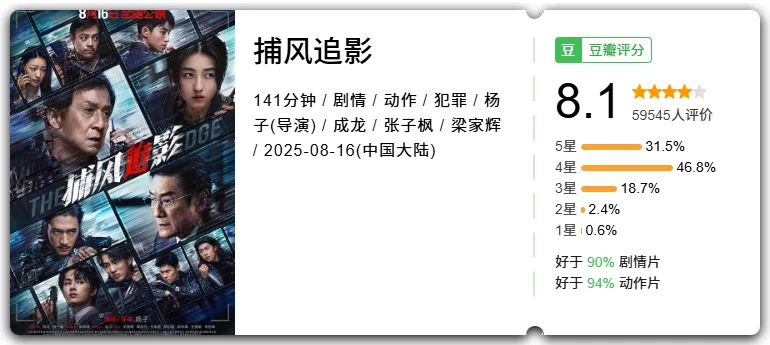 顶着外界先入为主的“烂片”质疑和刻板印象,《捕风捉影》在点映期间口碑持续逆风上行,8月16日正式上映后,骰盅终于揭晓:作为档期唯一的国产硬核动作类型片,豆瓣8.1分,猫眼专业版预测票房10亿+,大概率将成为暑期档季军,年度票房第六。