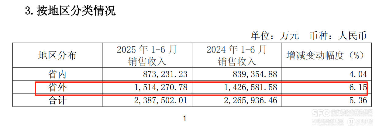 21世纪经济报道记者注意到,上半年其省外收入超过151亿元,同比增长6.15%,增速快于省内(同比增长4.04%)。汾酒目前超过六成的收入是来自山西省外。
