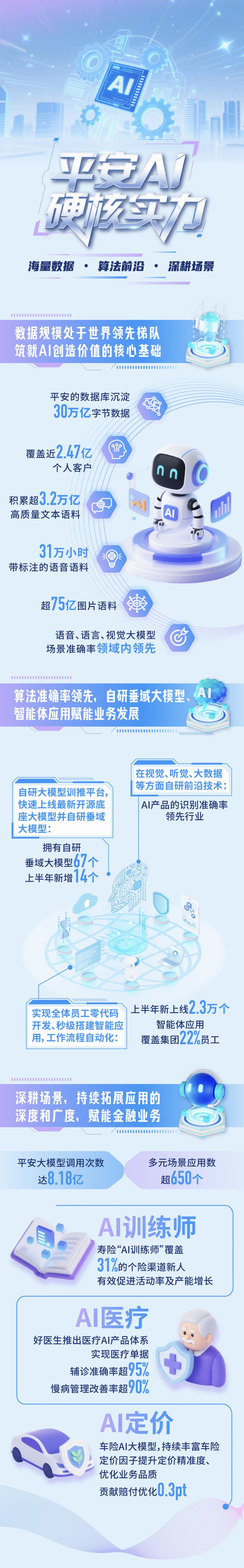 从业绩数据来看,强大的AI技术正深度融入平安金融主业的各类场景,成为平安高质量发展的重要引擎,在提升服务体验、优化运营效率、强化风险防控与驱动业务增长等方面发挥着不可替代的作用。