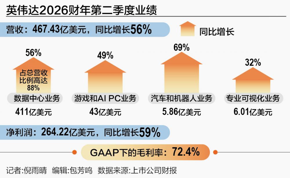 美东时间8月27日,AI巨头英伟达公布了2026财年第二季度业绩。财报显示,英伟达当季营收达467.43亿美元,同比增长56%;净利润为264.22亿美元,同比增长59%,GAAP下的毛利率为72.4%。