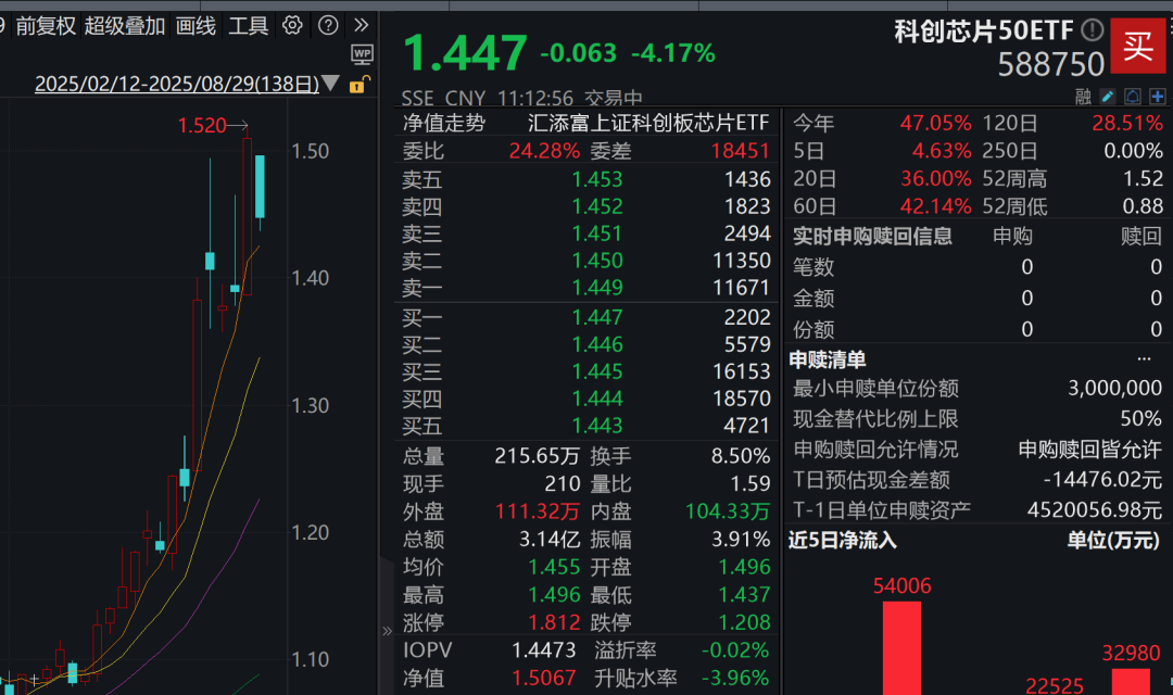 Wind数据显示,市场上规模最大的两只科创50ETF——华夏科创50ETF、易方达科创板50ETF,近5日分别净流出99.47亿元、40.32亿元。自7月底起,这两只ETF基金的份额就开始持续减少,尤其在近期科创50指数屡创新高后,资金赎回加速。