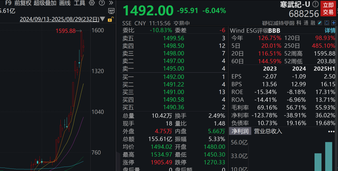 8月28日,寒武纪大涨15.75%,股价1587.91元/股,超越贵州茅台的1446.10元/股,登顶A股新“股王”,截至29日午盘,寒武纪今年以来已上涨126%。