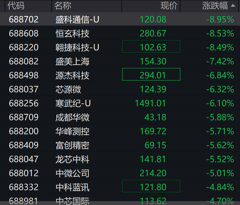 科创50指数一度跌超3%,芯片股集体调整,昨日登顶A股股王的寒武纪跌6%,股价跌破1500元。