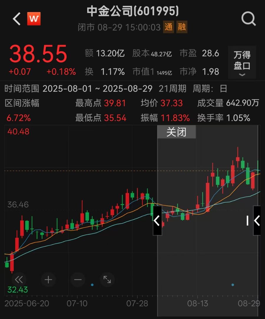 截至8月29日收盘,中金公司股价报38.55元/股,总市值为1495亿元。8月以来股价涨幅为6.72%。