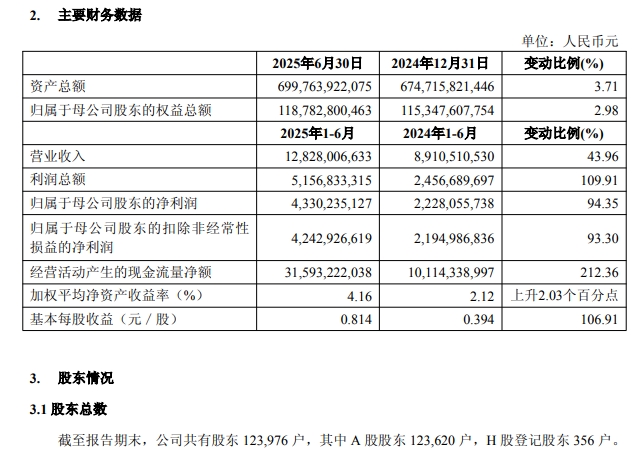 同日,中金公司发布2025年半年度报告:上半年,公司实现营业收入128.28亿元,同比增长43.96%;归属于上市公司股东的净利润43.3亿元,同比增长94.35%;基本每股收益0.814元。公司拟每10股派发现金股利0.9元(含税)。