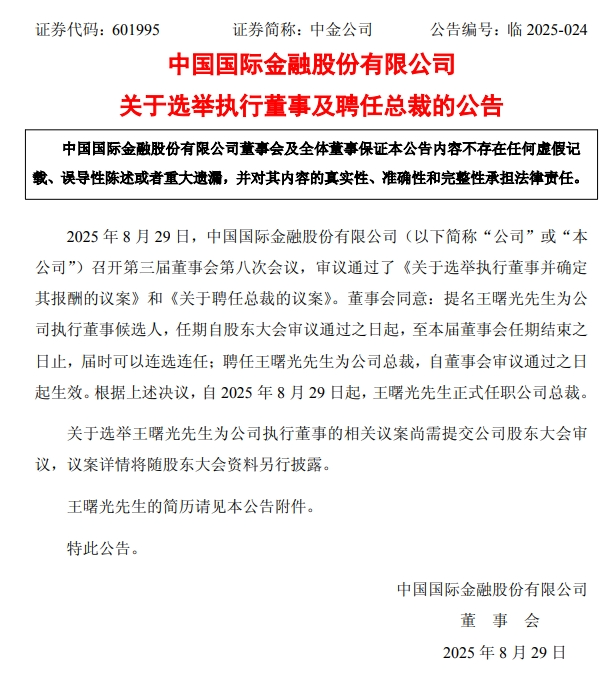 8月29日晚间,中金公司公告称,经董事会提名与公司治理委员会审核及建议,董事会同意聘任王曙光为公司总裁,自董事会审议通过之日起生效。王曙光作为公司高级管理人员的薪酬按照相关规定执行。自王曙光就任公司总裁之日起,公司董事长陈亮不再代为履行公司总裁职责。