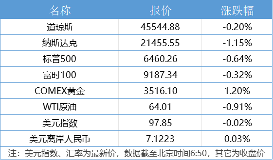 1、美国三大股指全线收跌,道指跌0.2%,标普500指数跌0.64%,纳指跌1.15%。卡特彼勒、英伟达跌超3%,领跌道指。万得美国科技七巨头指数跌1.31%,特斯拉跌超3%,脸书跌逾1%。中概股多数上涨,阿里巴巴涨近13%,大全新能源涨逾11%。