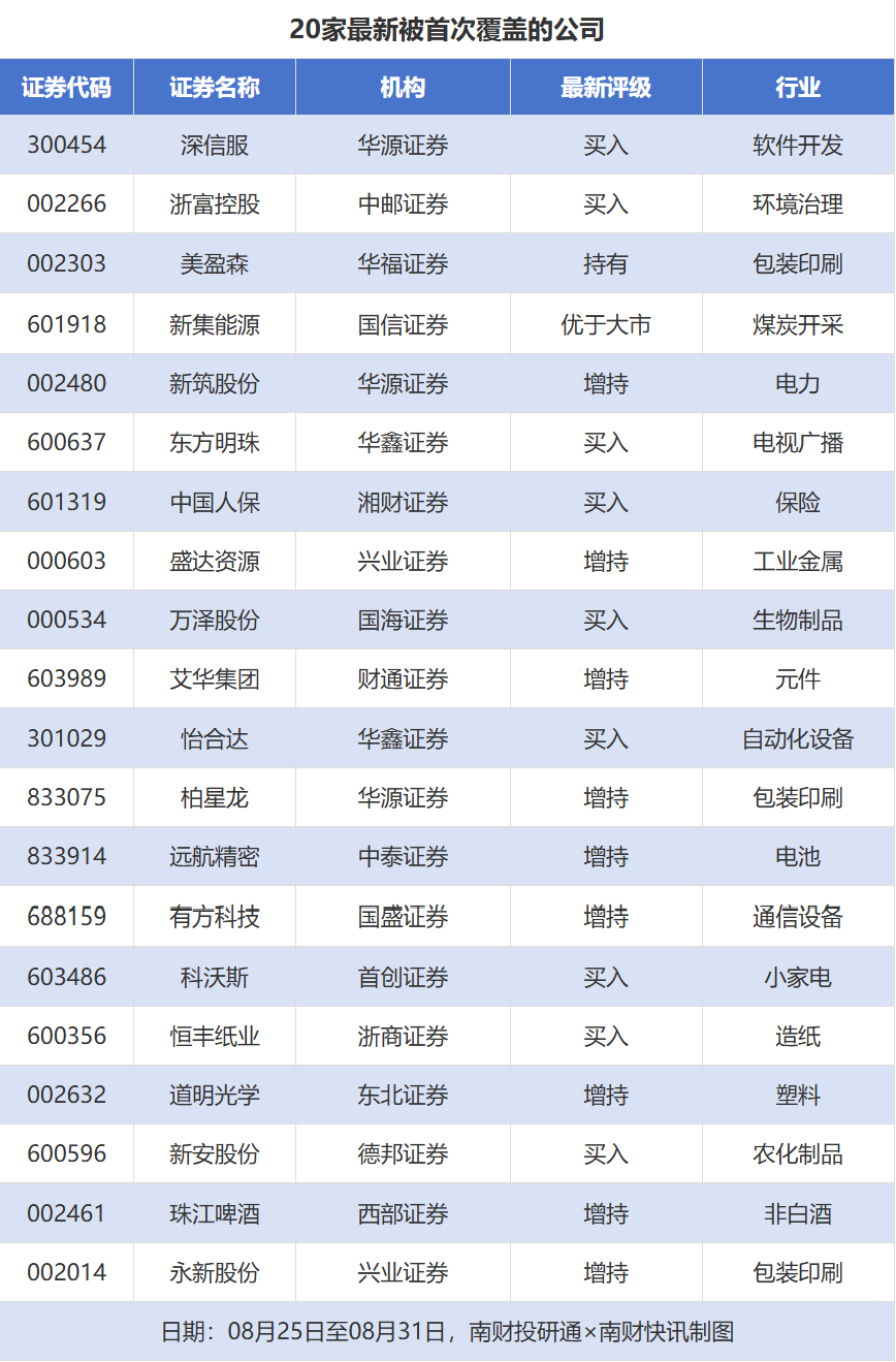 首次覆盖方面,8月25日至8月31日券商共给出了146次首次覆盖,其中深信服、新筑股份获得华源证券分别给予“买入”“增持”评级,浙富控股获得中邮证券给予“买入”评级,美盈森获得华福证券给予“持有”评级,新集能源获得国信证券给予“优于大市”评级。
