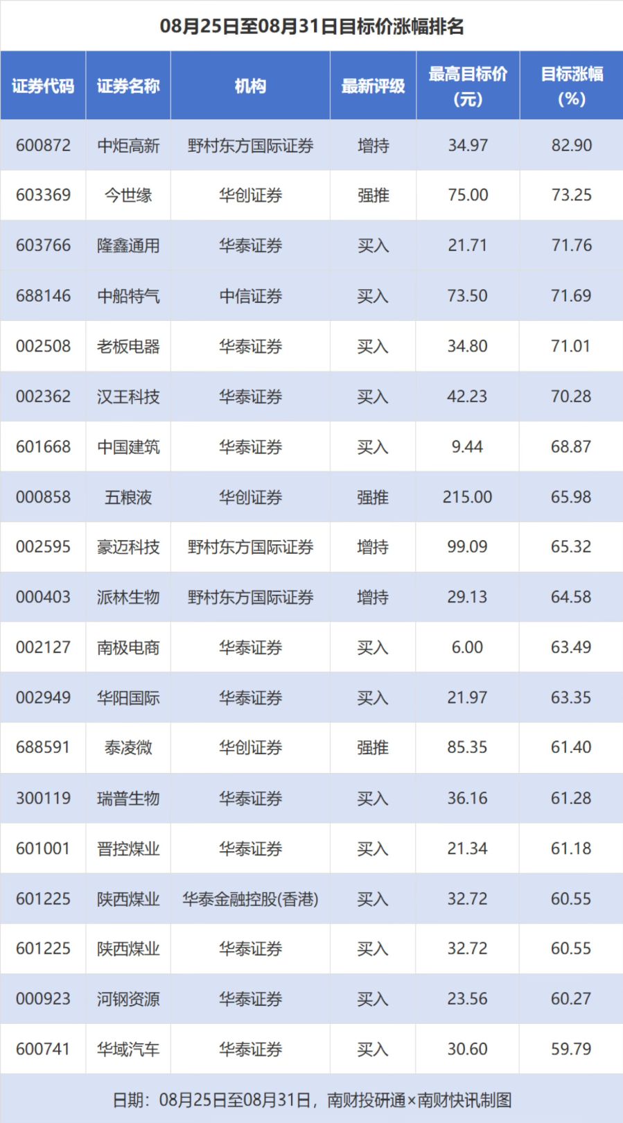 南财投研通数据显示,8月25日至8月31日,券商给予上市公司目标价共1346次,按最新收盘价计算,目标价涨幅排名居前的公司有中炬高新、今世缘、隆鑫通用,目标价涨幅分别为82.90%、73.25%、71.76%,分别属于调味发酵品、白酒、摩托车及其他行业。