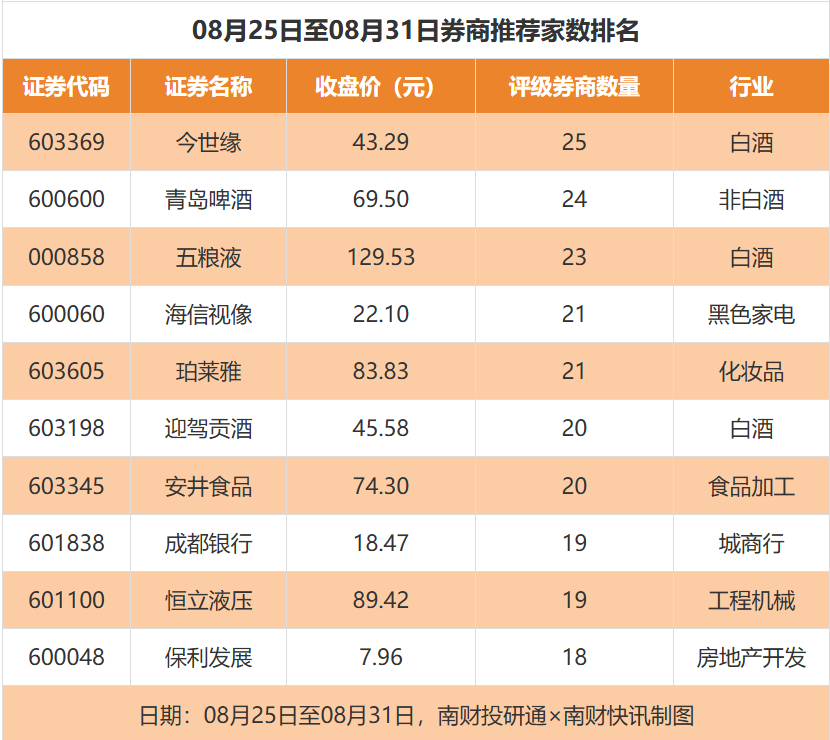 从券商推荐家数来看,8月25日至8月31日有1530家上市公司得到券商推荐,其中今世缘获得25家推荐,青岛啤酒获得24家推荐,五粮液获得23家推荐。