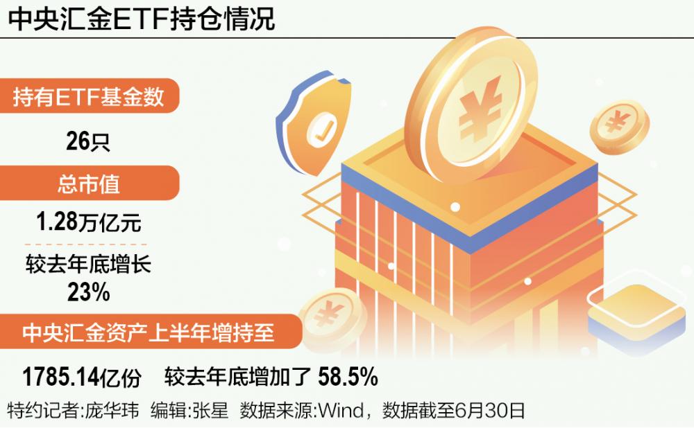 Wind统计显示,截至6月末,中央汇金投资有限责任公司(以下简称中央汇金投资)及其子公司中央汇金资产管理有限责任公司(以下简称中央汇金资产)合计持有股票ETF市值1.28万亿元,较去年底增加近23%。