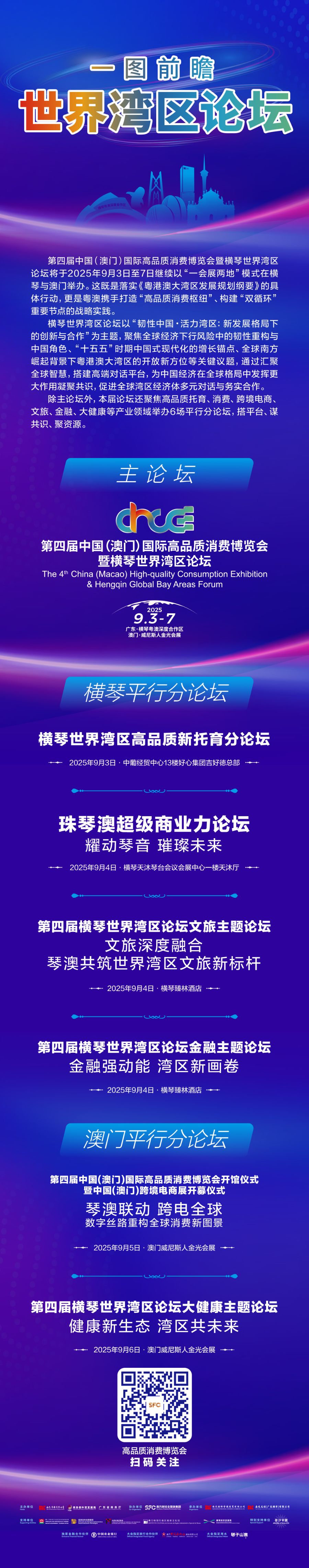 9月5日,第四届中国(澳门)国际高品质消费博览会暨横琴世界湾区论坛之开幕式暨主论坛,将以“韧性中国·活力湾区:新发展格局下的创新与合作”为主题,在横琴粤澳深度合作区盛大开幕。