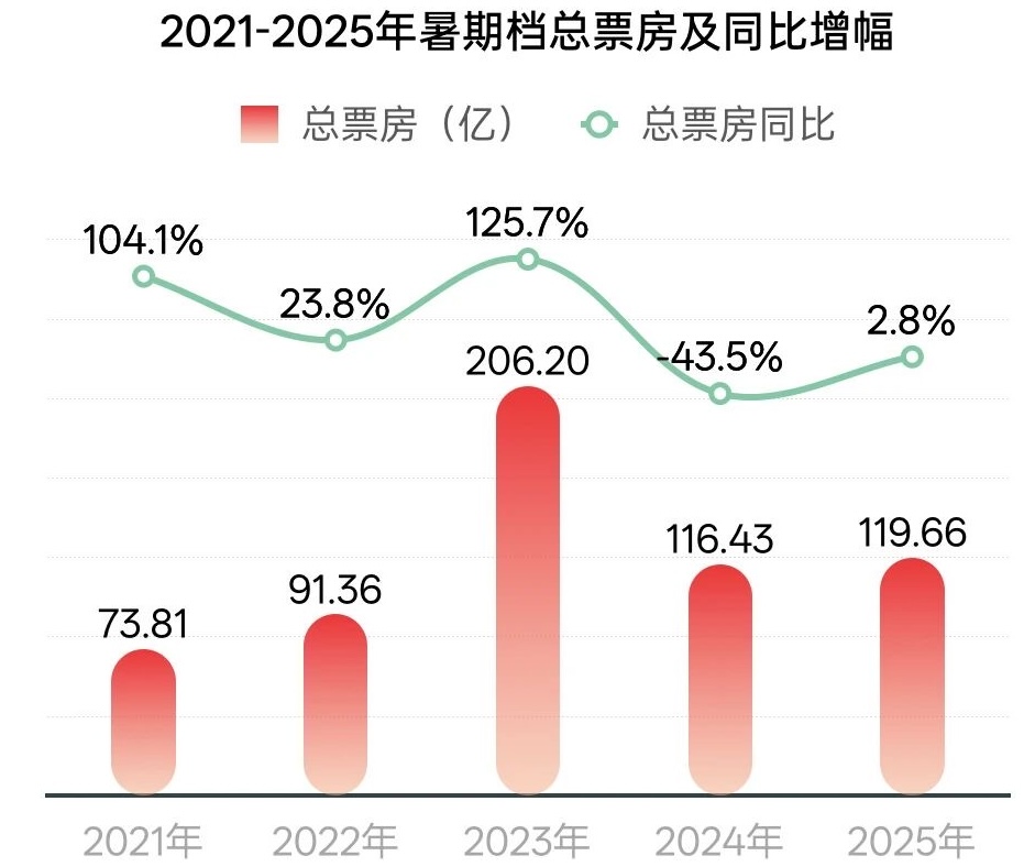 猫眼专业版、灯塔等多方数据显示,2025年电影暑期档(2025年6月1日-8月31日)以总票房119.66亿元收尾,这一数据同比增长2.76%。但需看到,在2023年,电影暑期档票房达到206.3亿元。在2019年,电影暑期档票房为177.8亿元。