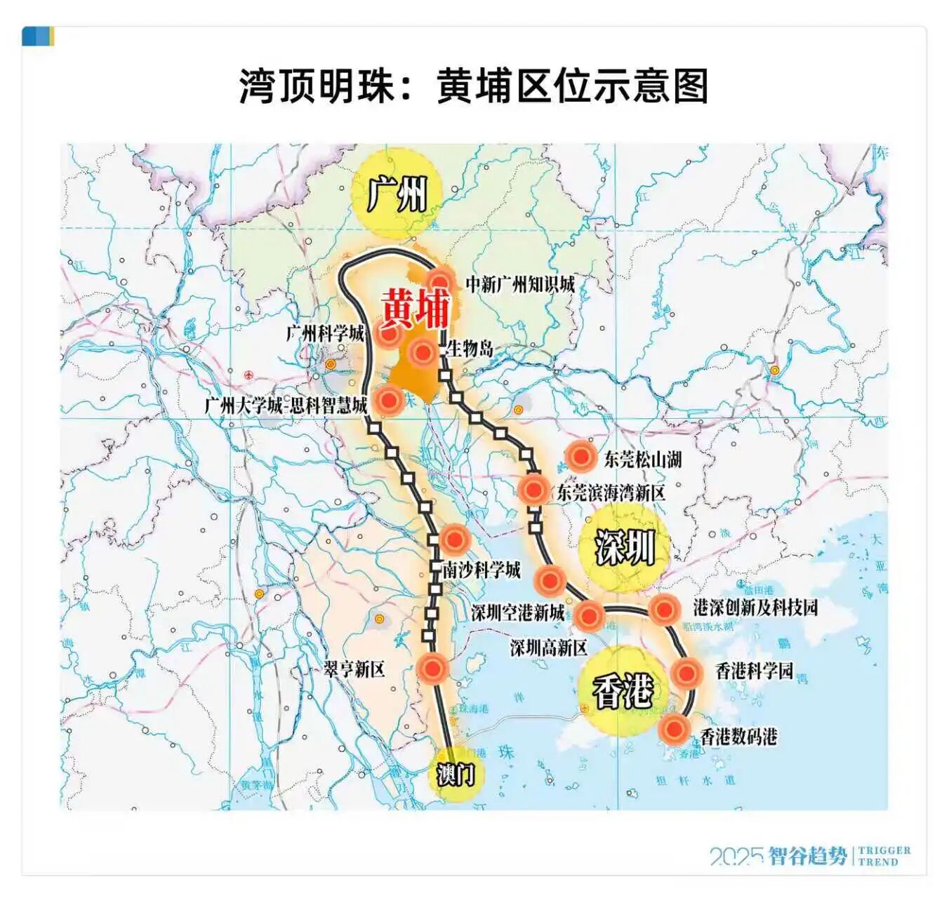 黄埔的位置,恰恰又是大湾区的“湾顶明珠”,串连广深港澳科创走廊的“C位”。