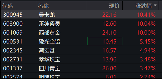 A股市场上,黄金珠宝板块持续活跃,莱绅通灵、西部黄金等个股涨停。
