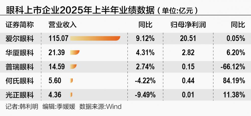 从营收表现看,爱尔眼科继续保持领先优势,以115.07亿元的体量领跑,展现出强劲的规模效应与市场竞争力;华厦眼科、普瑞眼科紧随其后,营收均突破14亿元;与之形成对比的是,何氏眼科、光正眼科的营收规模相对较小,徘徊在5亿元左右,且两家企业的营收均出现同比下滑,降幅分别为4.22%、9.49%。