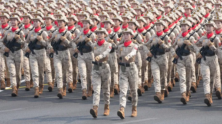 民兵方队全部由女民兵组成。这是民兵首次亮相以纪念抗战胜利为主题的阅兵活动。