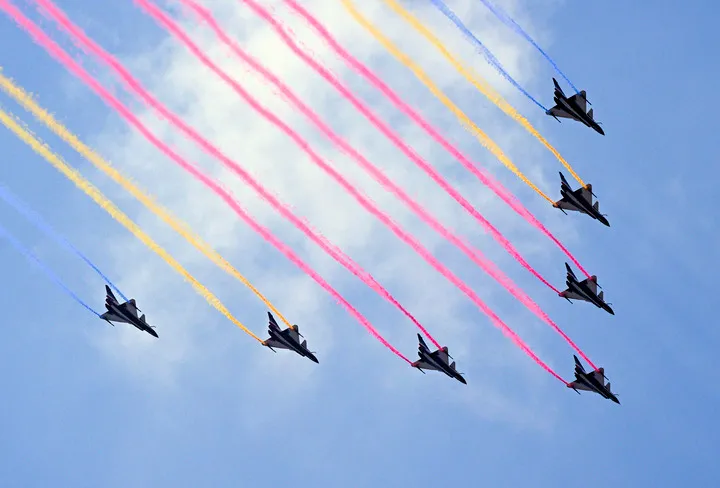 空军八一飞行表演队驾驶歼-10表演机,以超密集编队出场。7架战机在空中划出14道彩烟,寓意着中华民族14年可歌可泣的抗战历程,象征着14亿多中国人民奔向强国复兴的绚丽前景。