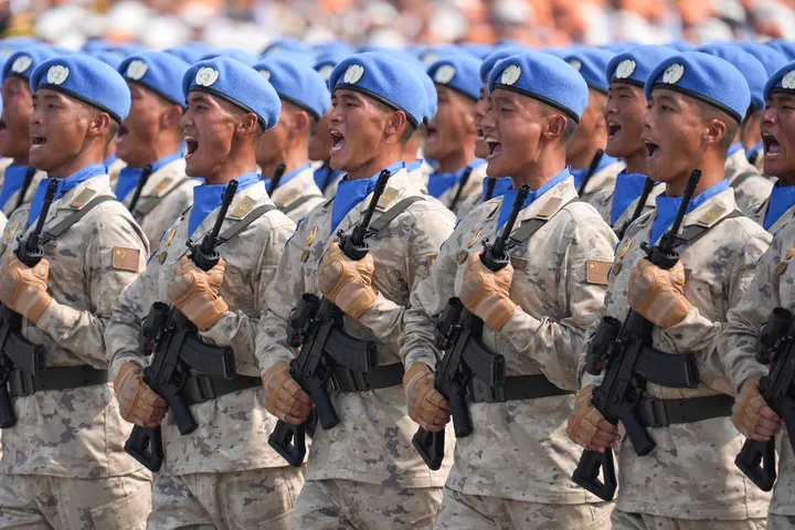 9月3日,纪念中国人民抗日战争暨世界反法西斯战争胜利80周年大会在北京隆重举行。这是维和部队方队接受检阅。新华社记者 万象 摄