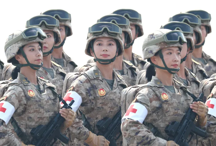 联勤保障部队方队队员涵盖军官、军士、义务兵、文职人员等军队各类型主体力量。男队员背负单兵作战突击背包,女队员背负新型卫生救治背包。