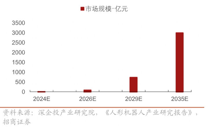 据财联社,摩根斯坦利近期报告预测,2050年人形机器人市场超5万亿美元,年复合增速超50%。此外,招商证券指出,根据2024年4月首届中国人形机器人产业大会上发布的《人形机器人产业研究报告》预测,2024年中国人形机器人市场规模约27.6亿元,2029年将有望达到750亿元,占世界总量的32.7%,到2035年有望超3000亿元规模。