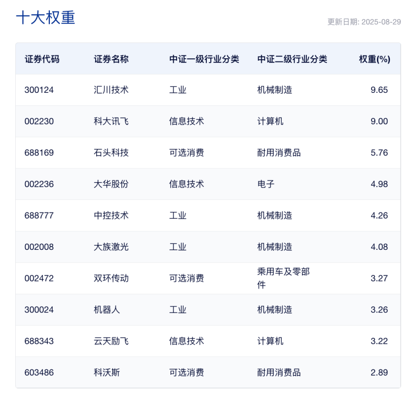 据Wind,截至9月2日,其前三大重仓的申万一级行业依次为:机械设备(55.83%)、计算机(19.92%)、家用电器(8.83%)。
