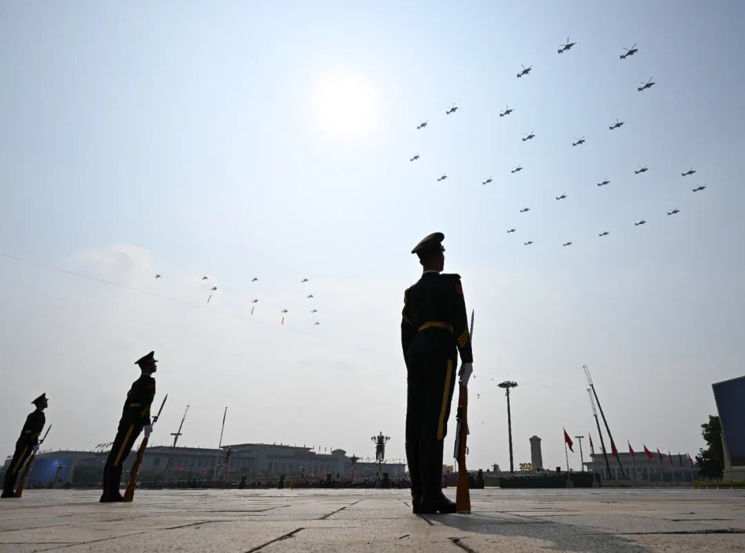 这是空中护旗梯队通过天安门广场,3架直-8L运输直升机分别悬挂“正义必胜”“和平必胜”“人民必胜”条幅。新华社记者 李钢 摄
