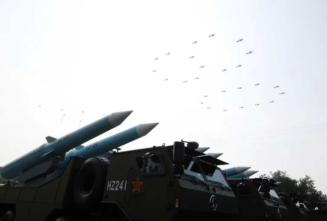 这是空中护旗梯队从反舰导弹方队上空飞过。新华社记者 林煜 摄