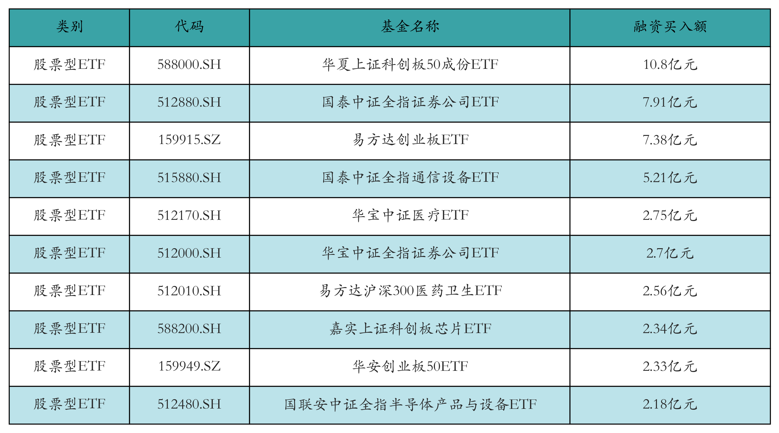 昨日股票型ETF融资买入额最高的3只ETF及其买入金额分别为:华夏上证科创板50成份ETF(10.8亿元)、国泰中证全指证券公司ETF(7.91亿元)、易方达创业板ETF(7.38亿元)。融资买入额前10详情见下表: