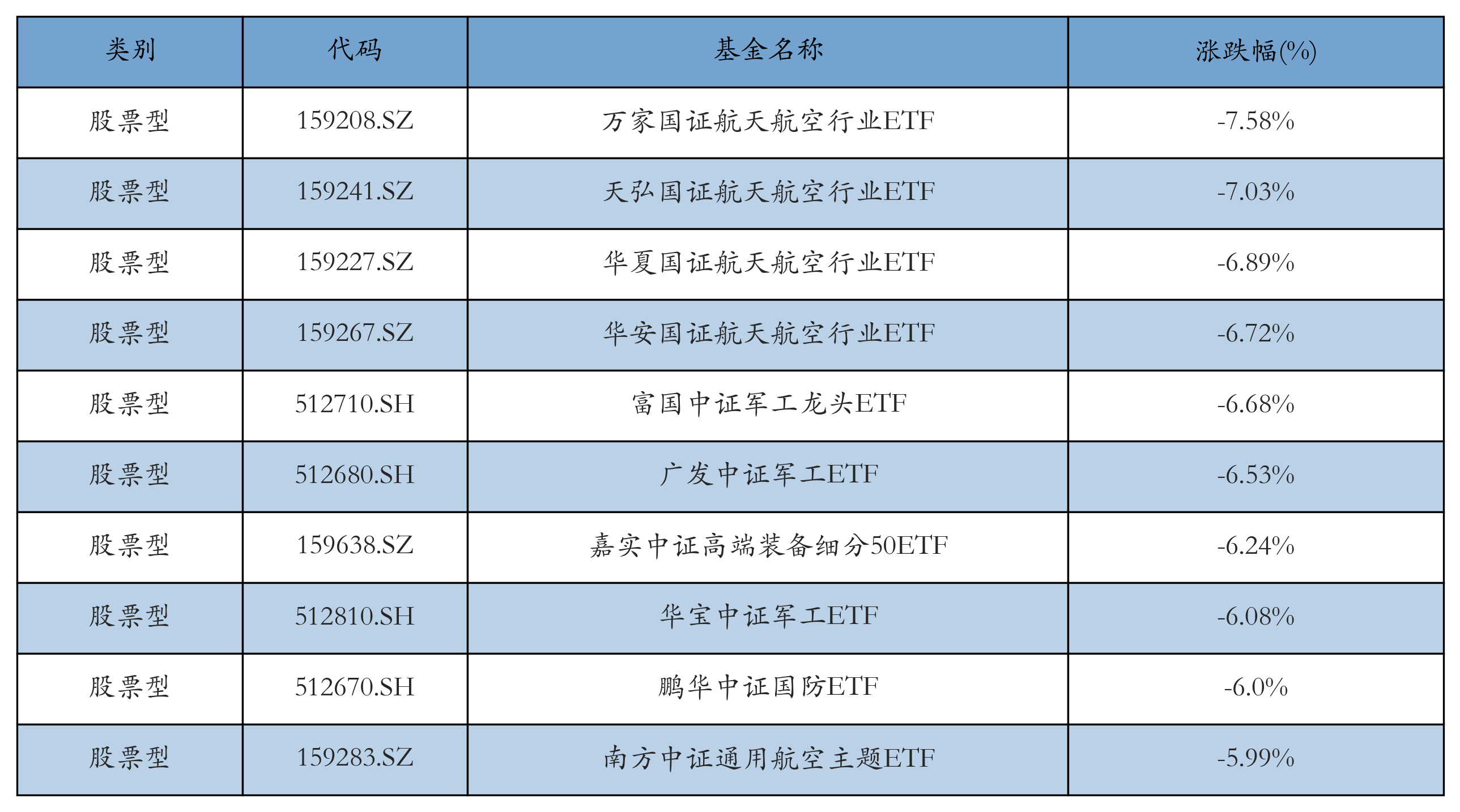 昨日股票型ETF跌幅最大的3只ETF及其收益率分别为:万家国证航天航空行业ETF(-7.58%)、天弘国证航天航空行业ETF(-7.03%)、华夏国证航天航空行业ETF(-6.89%)。跌幅前10详情见下表: