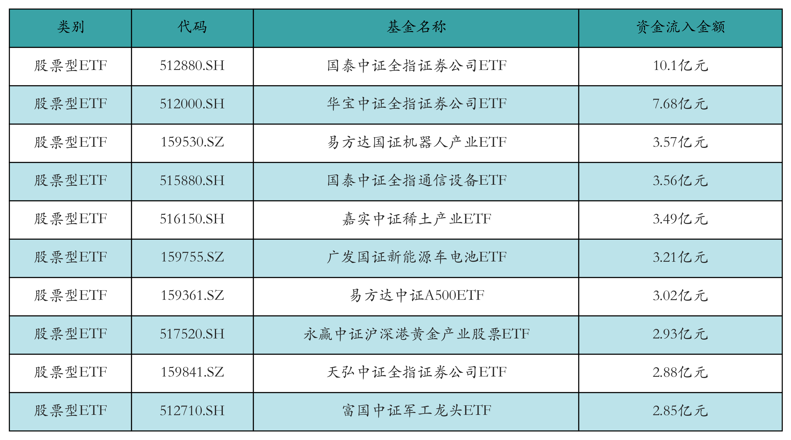 昨日股票型ETF资金流入最多的3只ETF及其流入金额分别为:国泰中证全指证券公司ETF(流入10.1亿元)、华宝中证全指证券公司ETF(流入7.68亿元)、易方达国证机器人产业ETF(流入3.57亿元)。资金流入前10详情见下表:
