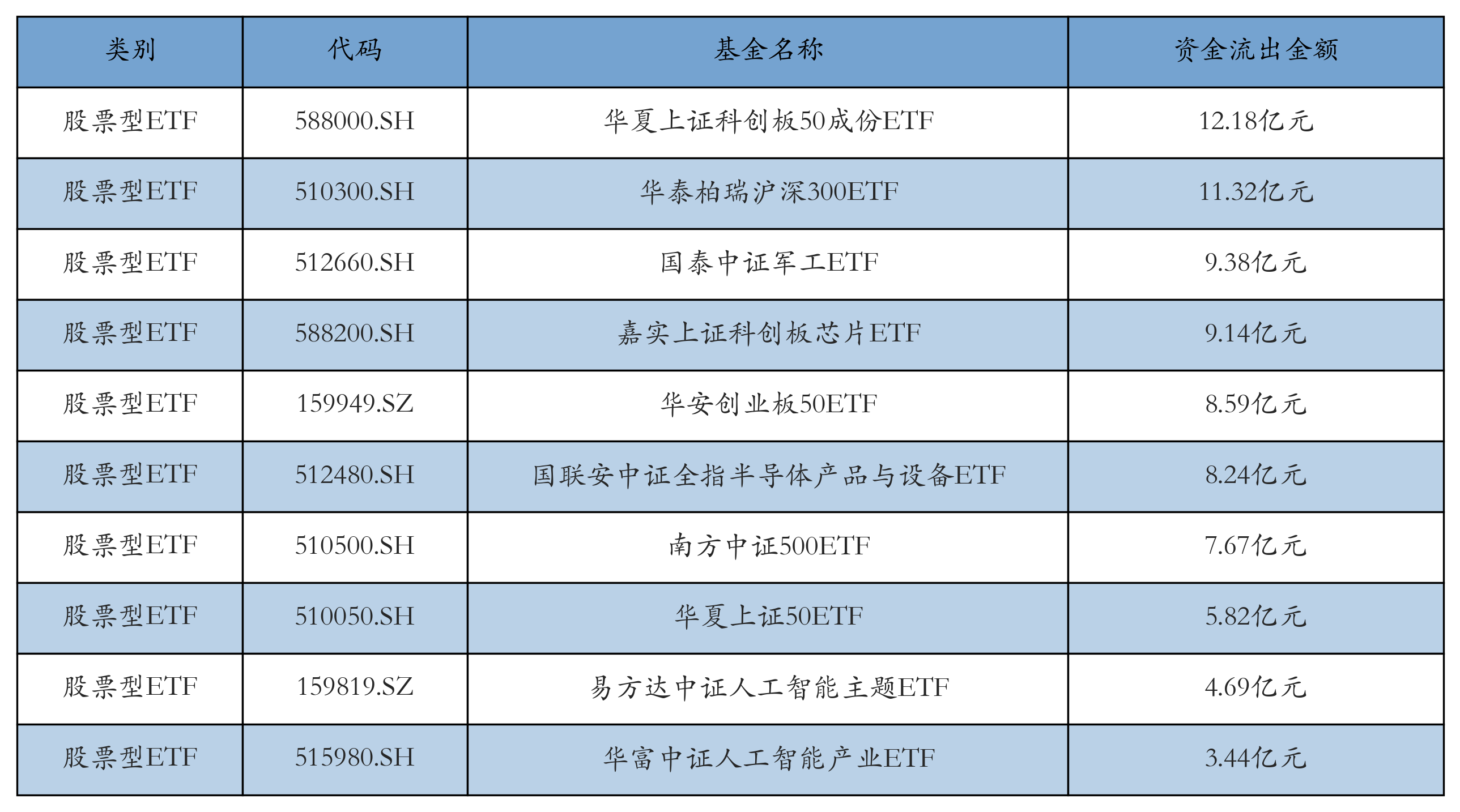 昨日股票型ETF资金流出最多的3只ETF及其流出金额分别为:华夏上证科创板50成份ETF(流出12.18亿元)、华泰柏瑞沪深300ETF(流出11.32亿元)、国泰中证军工ETF(流出9.38亿元)。资金流出前10详情见下表: